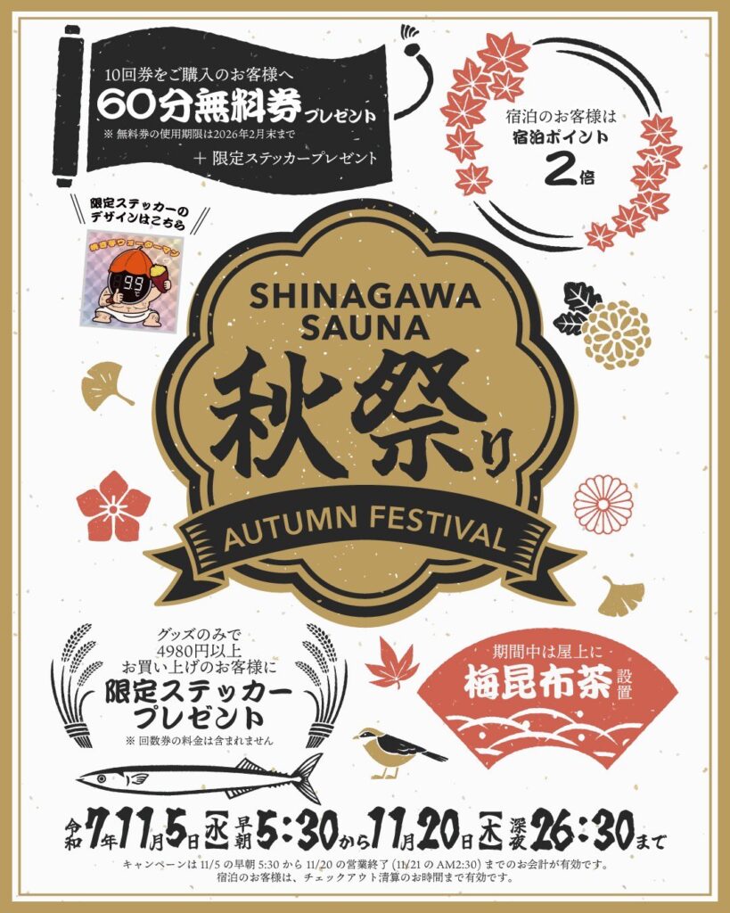 • 回数券10回券をご購入のお客様 60分無料券+「秋祭り限定」焼き芋ウォーターマンステッカーをプレゼント