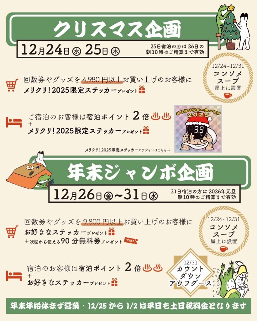 - 回数券やグッズを4,980円以上お買い上げのお客様に【メリクリ!2025限定ステッカー】をプレゼント
