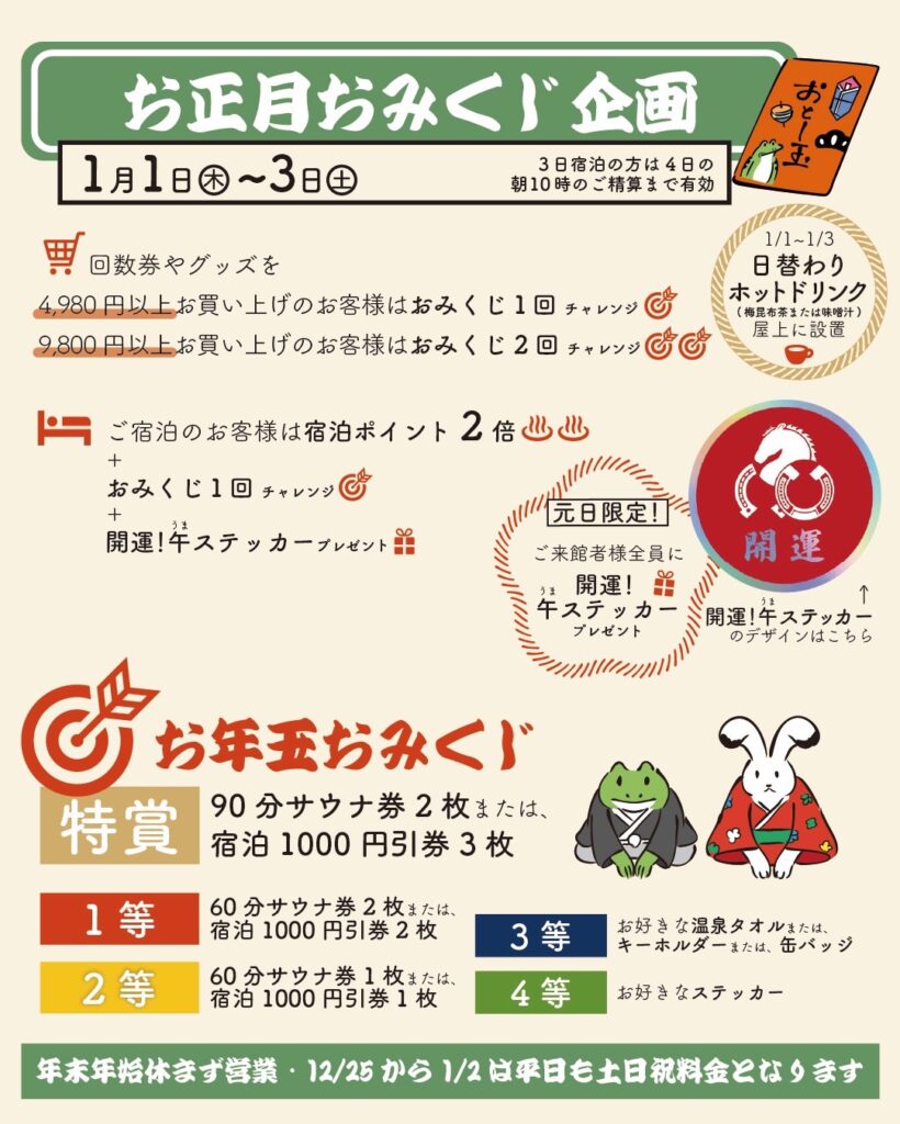 - 回数券やグッズを4,980円以上お買い上げのお客様に→お年玉おみくじ1回チャンス