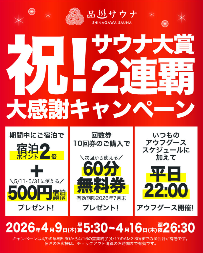 【SPA!サウナ大賞2連覇】大感謝キャンペーン(4/9〜16)開催のお知らせ
